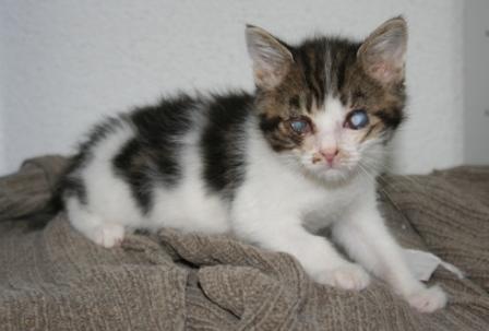Jungkatze, 8 Wochen alt, Erkrankung durch Felines Herpesvirus, mit Hornhautschädigung von beiden Augen